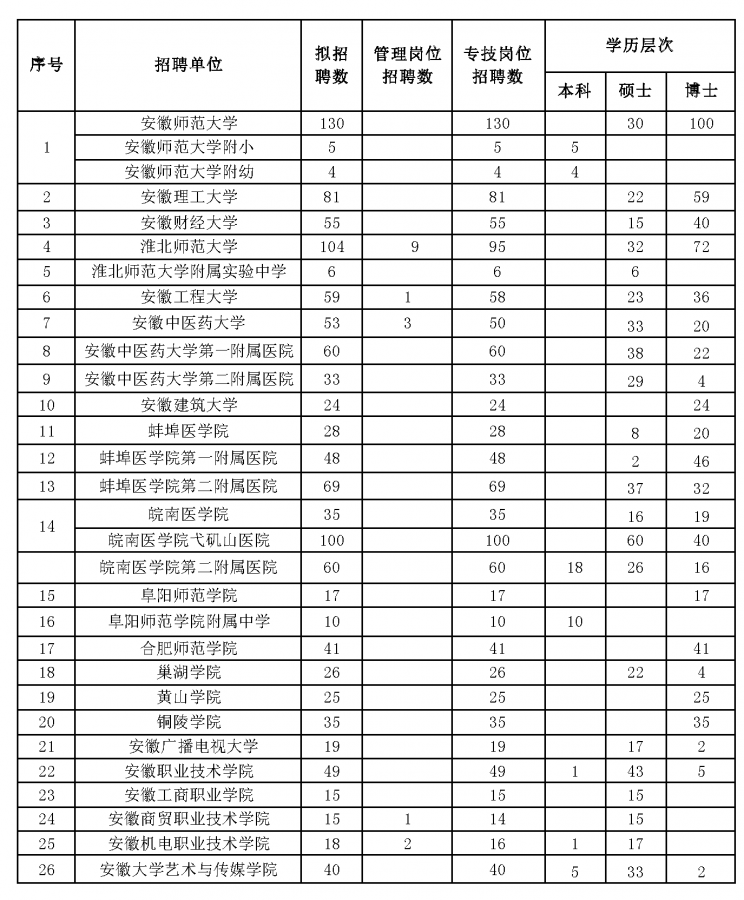 没有安徽农业大学,安徽大学,安徽工业大学的招聘计划