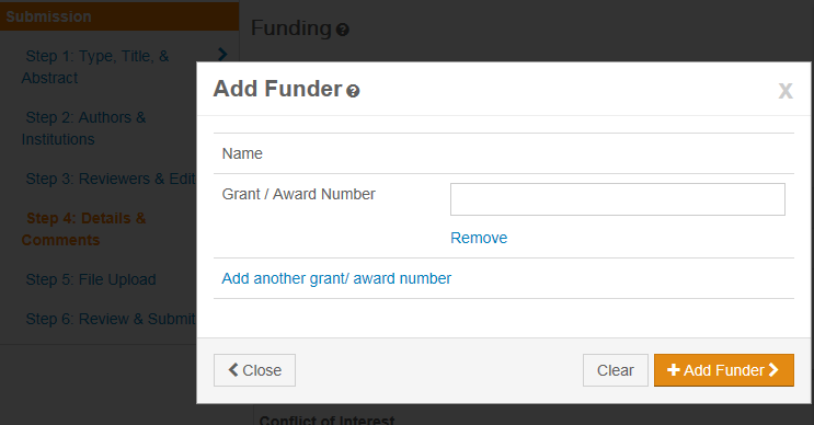 在ACS 的投稿系统里投稿, 当要填写选择基金名称时,点击add funder后,并没有能填入基金名称的选项。如图: 不知道是什么原因,求解。。
