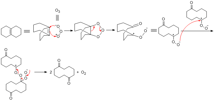 臭氧化过程如下,具体请参考《March高等有机化学——反应、机理与结构》原著第五版(修订)(Michael B. Simith; Jerry March 编著,李艳梅 译)第725页 19-9 臭氧化 章节内容。 DJ_Tokyo.gif ,