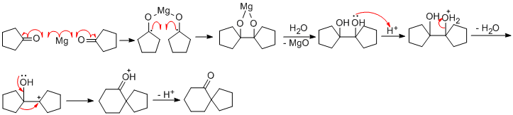 第一题的第一步是醛酮的双分子还原偶联反应,第二步是频那醇在酸性条件下的重排反应。其过程如下图所示。 DJ_Tokyo.gif