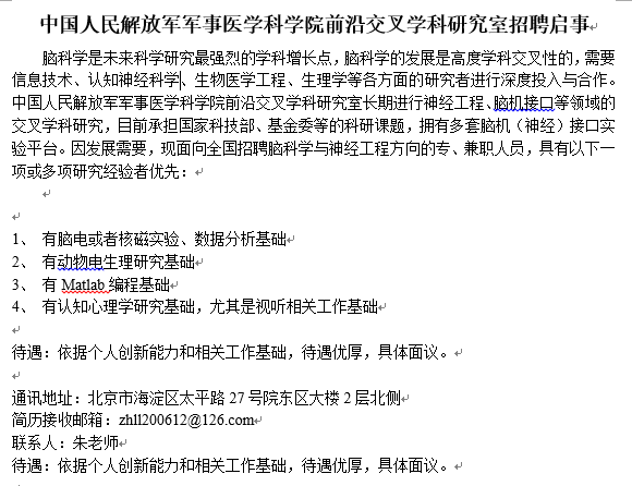 【招聘专、兼职脑科学研究人员】军事医学科学院前沿交叉学科研究室
