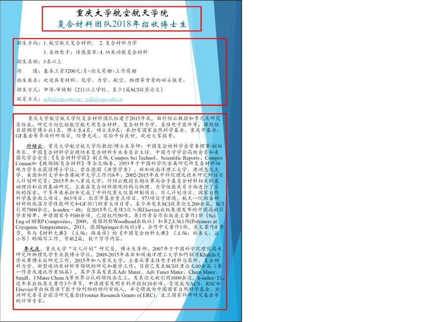 重庆大学航空航天学院复合材料团队组建于2015年底,由付绍云教授和李元庆研究员组成。研究方向包括航空航天用复合材料、复合材料力学、柔性电子器件等。课题组目前拥有博士后1名,博士生4名,硕士生9名;承担有国家自然科学基金、重庆市基金、GF基金等多项科研项目,经费充足、实验平台良好,欢迎大家报考。