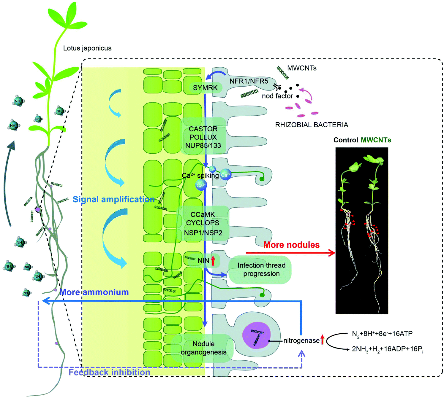 该项研究首次发现碳纳米材料中的多壁碳纳米管(o-MWCNTs)能够显著提高豆科植物百脉根(Lotus japonicus)共生固氮过程中的结瘤数及固氮酶活性,并深入研究了o-MWCNTs促进生物固氮的作用机制。