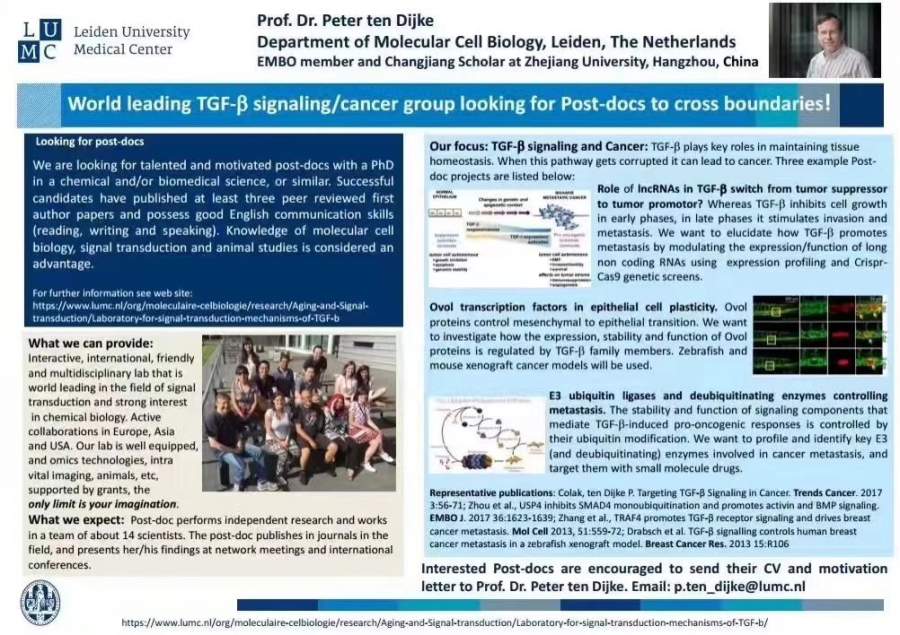 荷兰莱顿大学Peter ten Dijke教授实验室招聘博士后