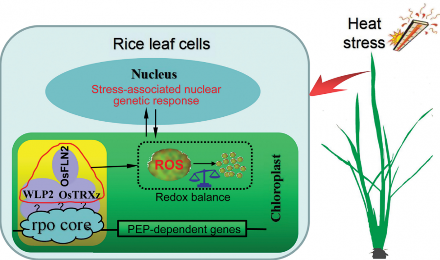 该研究利用EMS化学诱变的方法筛选到了两个幼苗期叶片在高温下白化致死的水稻突变体wlp2s、wlp2w,通过遗传学以及分子生物学等手段发现WLP2编码一个水稻PEP聚合酶复合体的重要成员。研究分析发现WLP2以及其同源蛋白OsFLN2与水稻硫氧还蛋白OsTRXz互作形成FLN-TRX调控模块,调控着PEP聚合酶在高温逆境下的氧化还原平衡,维持其转录活性。此外,wlp2w基因作为早期叶色标记在杂交水稻生产中具有一定的应用价值。