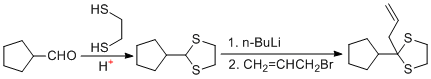 这题第一步就是相当于醛的保护,然后用丁基锂拔掉羰基碳的H形成碳负离子,与烯丙基溴发生亲核取代形成产物 DJ_Tokyo.gif