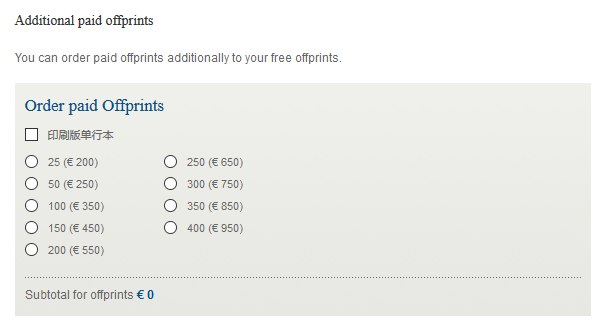 请问印刷版单行本是什么意思?是这一期的期刊吗,还是仅仅印刷你自己的文章?印刷版单行本有没有该期的封面封底和目录呢?我只需要两三本,怎么起订就是25本吗,200欧元还是不少钱啊。带封面封底和目录的纸质版期刊对于申请基金和评职称挺重要的,职能部门认这个,要是springer仅仅印刷文章的话我就没必要买了。以前在elsevier发文章,直接去他们的商店就能购买到2-3本某一期的期刊,我在springer上找了半天也没有发现在哪个地方可以单独买到期刊,只是可以买到成套的过刊,reprint服务又要100本起。大家都是怎么解决这个问题的?
