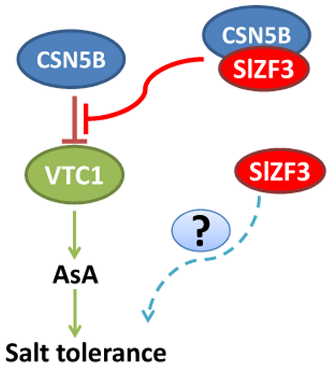 在课题组的前期研究中,通过植物芯片技术鉴定了一批盐胁迫快速响应的转录因子,其中包括一个C2H2型锌指蛋白SlZF3。番茄中虽然有超过100个基因编码锌指蛋白,但是功能得到鉴定的基因非常少。在该研究发现SlZF3的转录受盐胁迫快速诱导,在番茄和拟南芥中超表达该基因均能显著地提高耐盐性。进一步研究发现,SlZF3可以与COP9信号复合体(CSN)的亚基CSN5B蛋白互作,但是该互作如何影响植物的耐盐性的机理还不清楚。该课题组通过双荧光分子互补(BIFC)、荧光素酶报告系统分析、蛋白质免疫共沉淀(Co-IP)以及蛋白质杂交(Western blot)等多方面的实验发现SlZF3可通过干扰CSN5B与VTC1互作,从而阻止CSN5B对VTC1的降解,VTC1的积累导致抗坏血酸的合成增强。抗坏血酸积累使得植株清除ROS的能力增强,植株抗逆性得到提高。