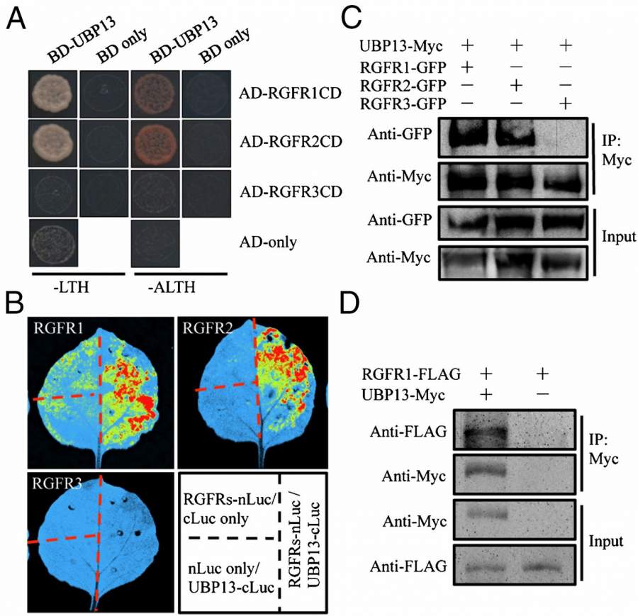 在拟南芥已经发现的600多种RLKs中,还有其他的RLKs会被泛素化修饰。例如,FLS2 是分别为细菌鞭毛蛋白的受体,在拟南芥中启动免疫信号传导。鞭毛蛋白结合会促进FLS2与E3泛素连接酶PLANT U-BOX 12(PUB12)的相互作用导致FLS2最终被26S蛋白酶体降解。还有其他类似的调查结果表明,泛素化RLK会减少细胞表面受体的数量并减弱细胞对细胞外信号分子的敏感性。动物细胞的多项研究有表明质膜上的泛素化受体激酶可以被DUB去泛素化,逆转这些受体的降解,维持其稳定性并重新设置细胞对细胞外信号的敏感性。我们对UBP13去泛素化RGI1的研究表明DUBs介导的受体激酶稳定化也存在于植物中。因此我们的工作提供了新的有关植物细胞表面RLKs动态调节的新机制。