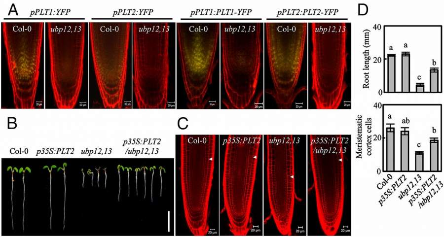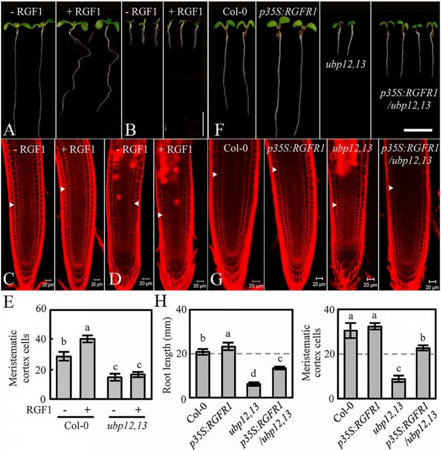 文献题目:Regulation of the stability of RGF1 receptor by the ubiquitin-specific proteases UBP12/UBP13 is critical for root meristem maintenance