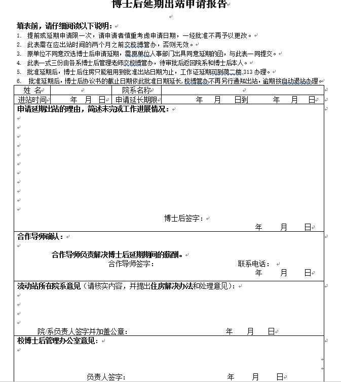 问问你们学校人事处吧 我没申请过,每个学校流程都有所不同 我们以前学校提前或延期出站都要填一个申请表 提前-延期.jpg ,
