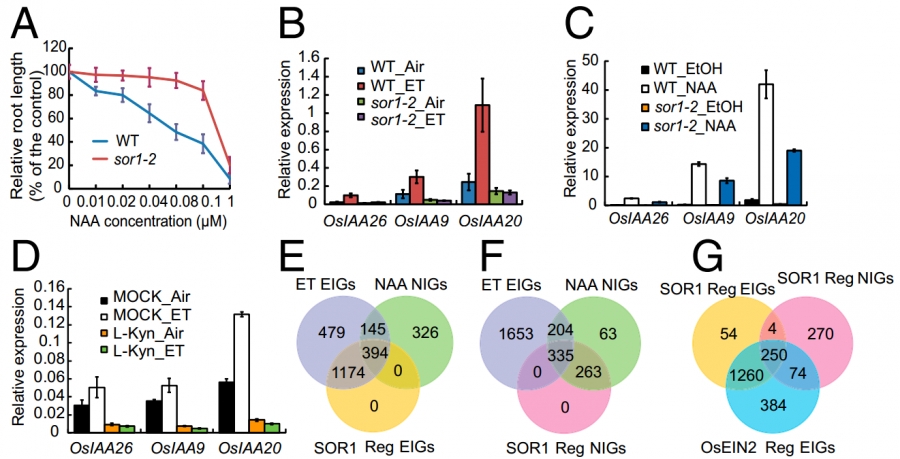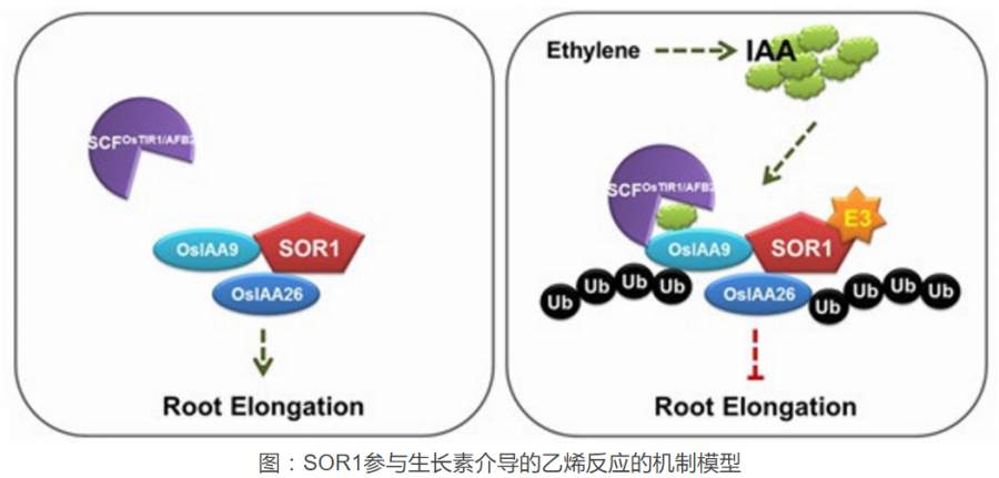这一新颖的研究成果揭示了SOR1-OsIAA26信号模块位于TIR1/AFB2-auxin-OsIAA9信号下游,特异地调控了水稻根部的乙烯反应。