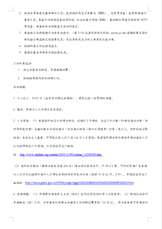 4. 其他待遇:(1)申请享受香港中文大学(深圳)校内住房或深圳市人才租赁房;(2)期满出站后可申请留校(深)工作,并申请深圳市博士后留深工作科研经费资助(30万元),符合条件者可申请深圳市人才认定及奖励补贴(例如深圳市后备级领军人才奖励补贴税后30万元,龙岗区深龙英才C类奖励补贴税后15万元/年,5年)。