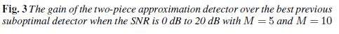\caption{The gain of the two-piece approximation detector over the best previous suboptimal detector when the SNR is 0 dB to 20 dB with $M = 5$ and $M = 10$}