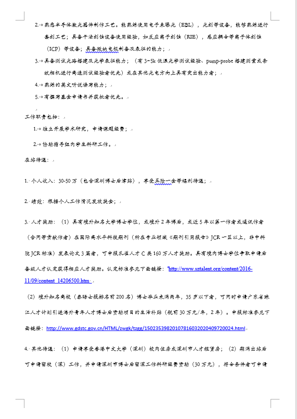 4. 其他待遇:(1)申请享受香港中文大学(深圳)校内住房或深圳市人才租赁房;(2)期满出站后可申请留校(深)工作,并申请深圳市博士后留深工作科研经费资助(30万元),符合条件者可申请深圳市人才认定及奖励补贴(例如深圳市后备级领军人才奖励补贴税后30万元,龙岗区深龙英才C类奖励补贴税后15万元/年,5年)。