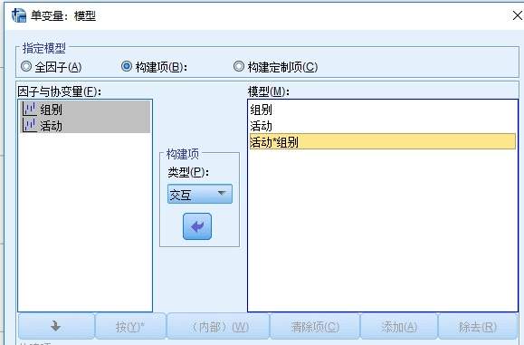单因素>模型里选择交互,把需要检验交互的两个指标一起选定到右边的框里