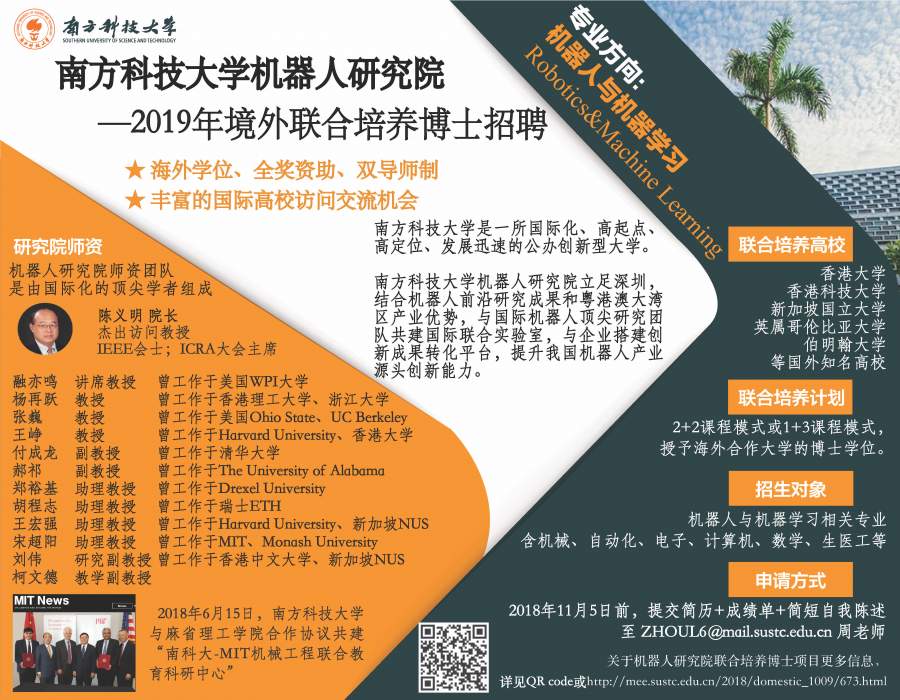 【南方科技大学机器人研究院 —2019年境外联合培养博士招聘】