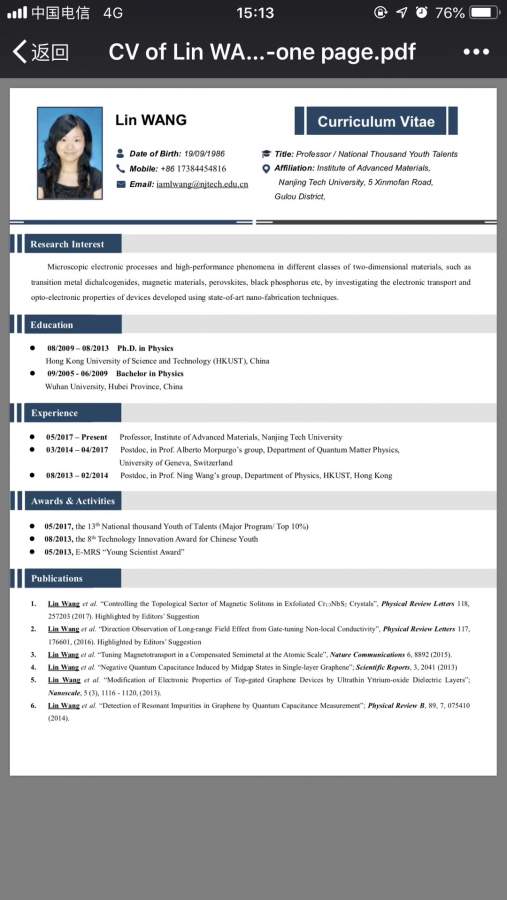 研究新型二维纳米材料中的基础物理现象和优异电学性质:通过设计、制备和测量基于二维纳米材料的微纳米级电子器件,探索新奇微观电子行为和开发高效电学性能,包括石墨烯,过渡金属硫化物,手性磁性材料, 黑磷等。先后在nature communications、physical review letters、advanced materials、nano lettets等sci刊物上发表学术论文30余篇,同行引用700余次,获得了第八届中国青少年科技创新奖和欧洲材料学会青年科学家等荣誉称号。