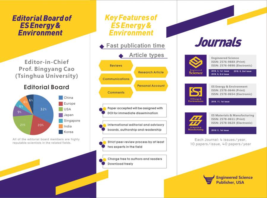 ES Energy & Environment期刊第1期论文已正式上线https://espublisher.com/allIssue ... 2&volume=1. 敬请各位专家学者多投稿、审稿,多浏览、下载和引用本期刊论文,也敬请您多提宝贵意见,以便我们后期进一步优化和改进本期刊质量,感谢您的大力支持.