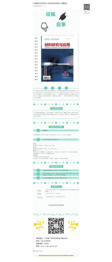 广东省新材料研究所«材料研究与应用»是由广东省科学院主管、广东省新材料研究所主办的技术类期刊,季刊,国内外公开发行。为了反映材料领域的最新科技动态,宣传学科带头人,本刊增设“特约文章”专栏。特约文章优先发表,稿酬丰厚,欢迎各位专家、学者踊跃投稿。