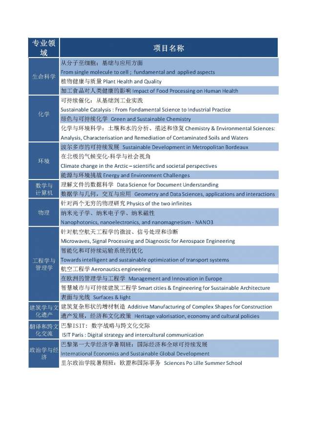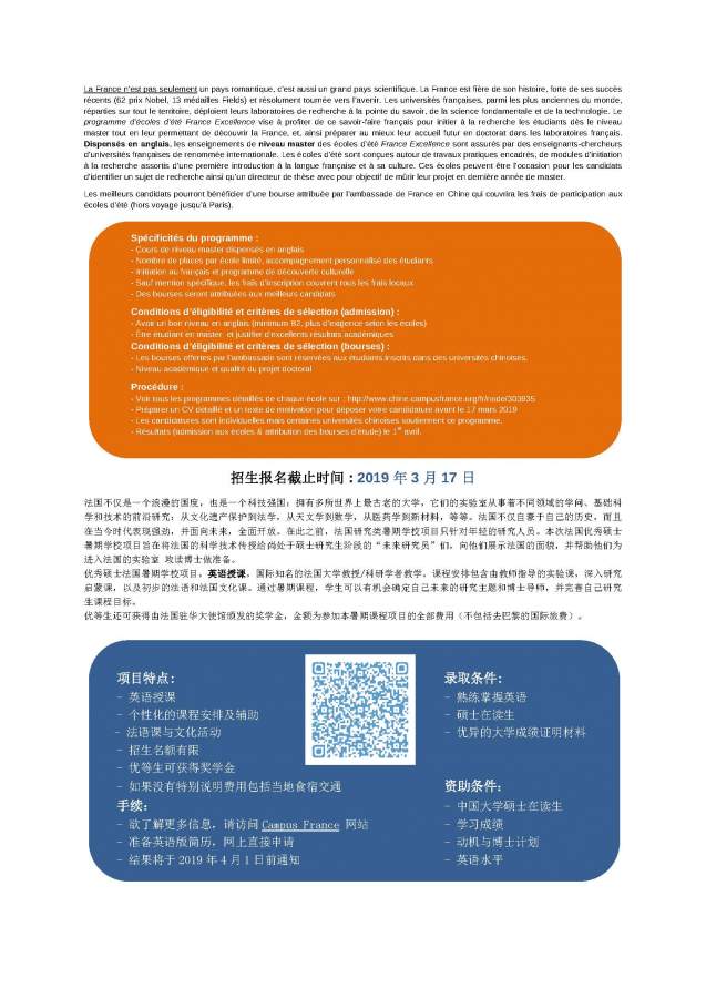 (1)法国优秀硕士暑期学校项目旨在将法国的科学技术传授给尚处于硕士研究生阶段的“未来研究员”们,向他们展示法国的面貌,并帮助他们为进入法国的实验室 攻读博士做准备。