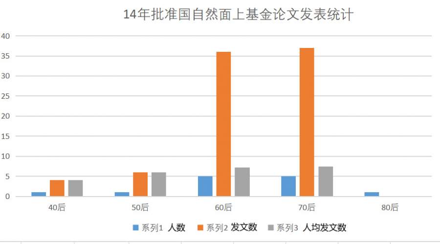 从分析图可见,这个国自然小领域的生态现状,面上基金的获得者年代分布非常广,横跨40年,但是主力还是60、70后,在14年立项的课题中,60和70后在立项数、发表论文总数和人均发文数上,基本不相上下,70后有略微一点点的领先,而80后在面上项目上还没出发挥水平。