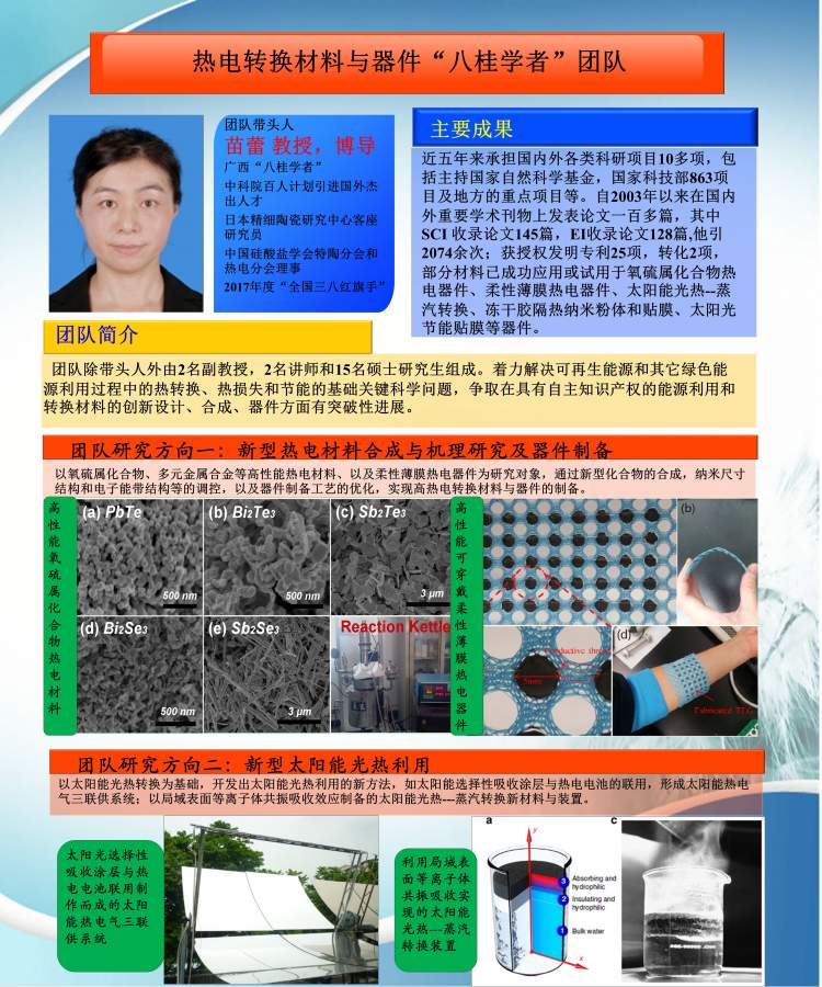 热电转换材料与器件 广西“八桂学者”团队有研究生导师3人(苗蕾、刘呈燕、周建华),讲师2人(高杰、刘静),在读博士生3人,在读研究生15人,现拟招收研究生。