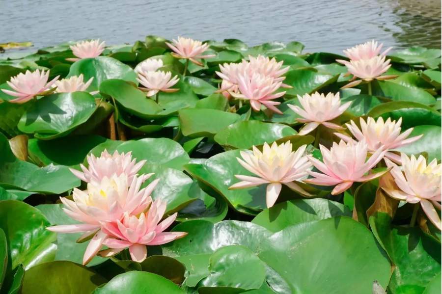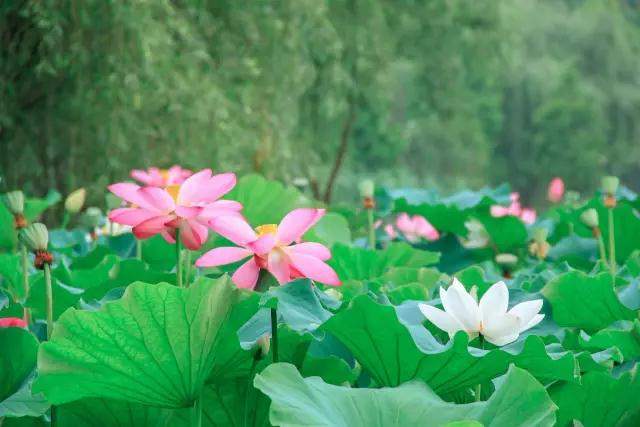 湖心散布着绿意,绿上点缀着新异——淡黄的雅致,浅粉的端庄;盛放的耀眼,含苞的娇羞......