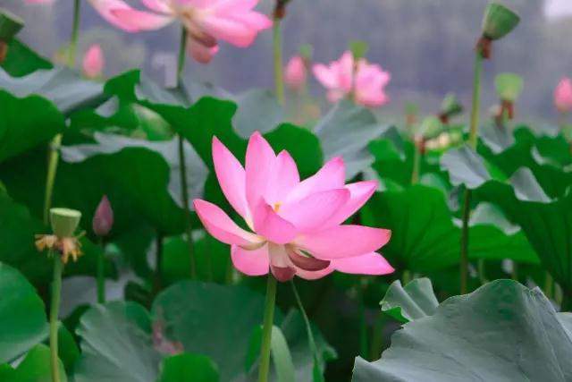 “接天莲叶无穷碧,映日荷花别样红”。不错的,夏日耀眼的阳光照射在湖面,波光粼粼。满池的荷叶挤挤挨挨,相互接壤,互相遮蔽,绿意油油。粉嫩的花瓣就这样在一片绿意中舒展开来,自然而又惊艳。配合着艳阳的辉映,花儿由粉渐渐变得艳粉,深粉......