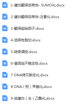 (1)1-蛋白翻译后修饰- SUMO化 (2)2-蛋白翻译后修饰-泛素化 (3)3-翻译起始因子 (4)4-选择性剪切 (5)5-转录调控 (6)6-基因组不稳定性 (7)7-DNA拷贝数变化 (8)8-DNA(羟)甲基化 (9)9-组蛋白(去)乙酰化
