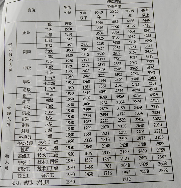 一般高校入职前几年享受副教授待遇,从图1可以看出,如果该领导(或老教师)入职超过十年,那么光薪级工资每月就比你多500。从图2可以看出,就算同是副高7级岗位,岗位津贴也至少比你多将近300。光这两项就有800的收入差距,如果人家是副高6级,那差距更大了。此外公积金等其他收入组成随工龄如何增长还未知。