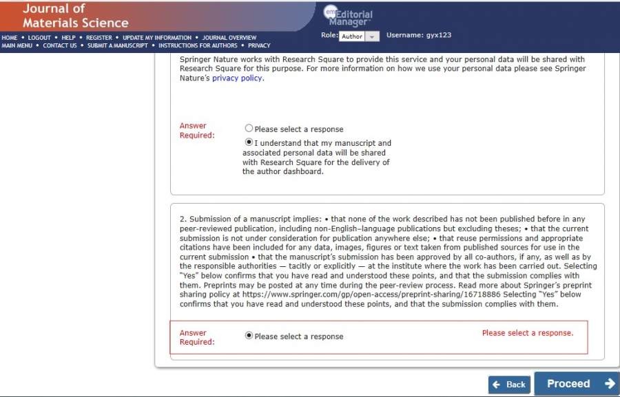 层主好!在期刊journal of material science投稿步骤中,有一项是选择回答附加问题,但最后一个问题没有答案选项,这是怎么回事呢?求助!
