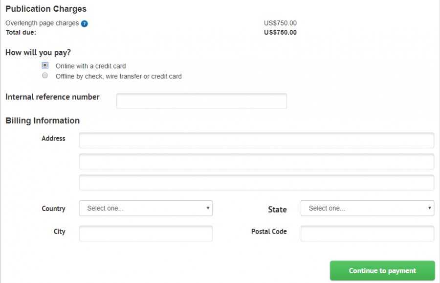 1.选择online方便,双币信用卡支付即可 2.付款后,页面有交易信息以及邮件发送到通讯作者.3.按照美元计算,与每天汇率有关