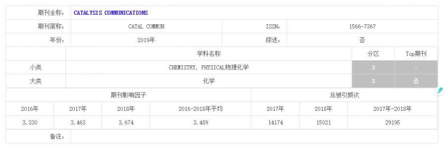 期刊全称: CATALYSIS COMMUNICATIONS 期刊简称: CATAL COMMUN ISSN: 1566-7367 年份: 2019年 综述: 否 学科名称 分区 Top期刊 小类 CHEMISTRY, PHYSICAL物理化学 3 - 大类 化学 3 否 1.JPG ,