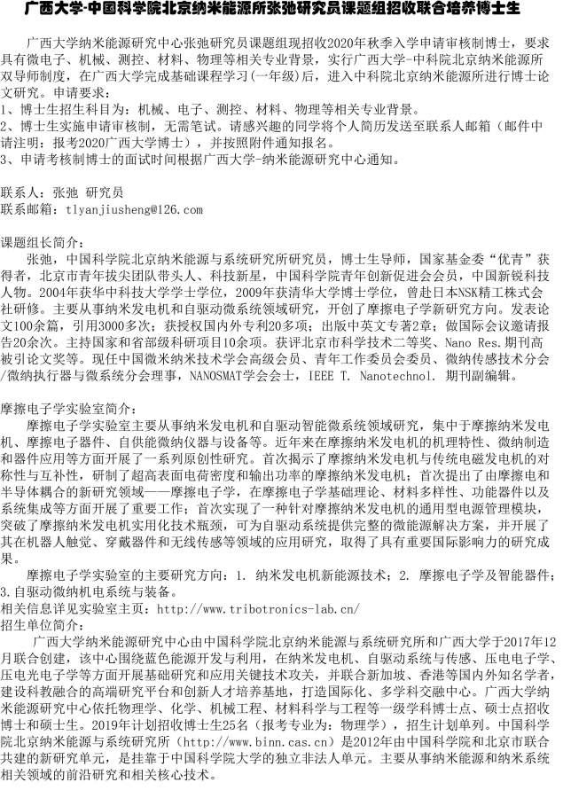 详细内容请见附件 广西大学关于2020年博士公开招生考试报名截止时间延期有关工作的通告.jpg 广西大学-中国科学院北京纳米能源所张弛研究员课题组招收联合培养博士生.jpg