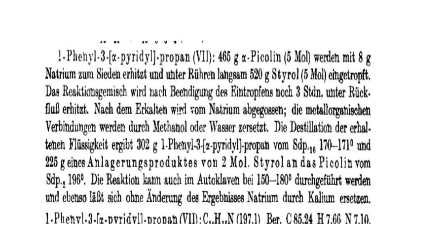 Phehyl-3-[a-pyridyl]-propane (VII)的制备:将 465 g 的阿尔法-甲吡啶(5摩尔)与8g Na一起加热沸腾,一边搅拌一边缓缓滴入520 g Styrol(5 摩尔) 。滴定结束后反应混合物继续回流加热3小时。冷却后倒掉钠,通过乙醇或者水破坏金属有机键。蒸馏得到的液体得到302g的l-Phehyl-3-[a-pyridyl]-propah(沸点170-171摄氏度)和的溶解于苯乙烯中的225g甲基吡啶(沸点196摄氏度)。反应也可以在150-180摄氏度的高压锅里进行,用钾代替钠就能得到同样结果,