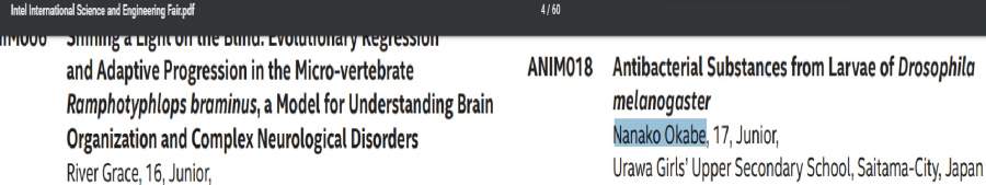 冈部七子 英文名字: Nanako Okabe 2016 年在英特尔博览会发表有关抗菌素的论文海报: Antibacterial Substances from Larvae of Drosophila melanogaster REF: https://abstracts.societyforscience.org/Home/PrintPdf/10734 之后入东京大学 REF: https://www.todaishimbun.org/students_research20180718/ ----------------- 岡部七子 - ISEF 2016 海报标题.jpg ,