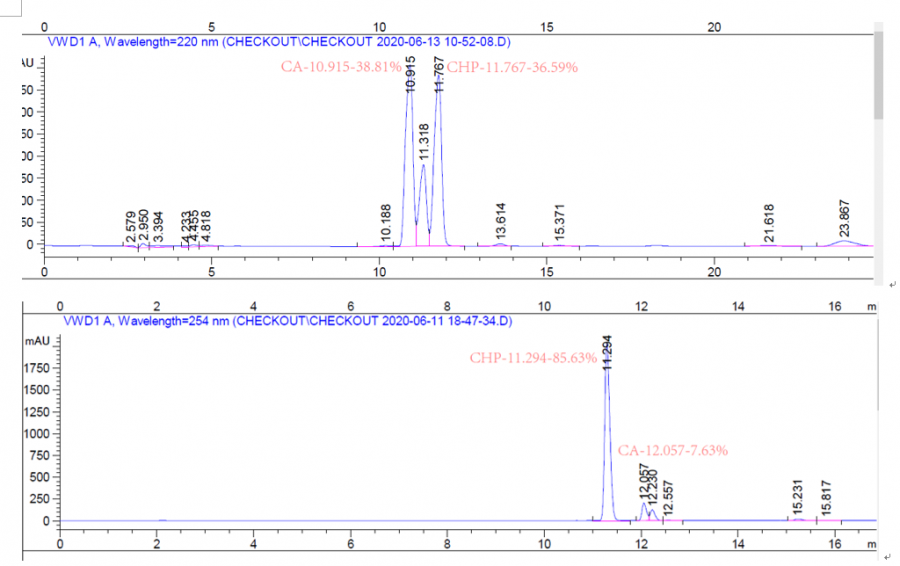 上图是乙腈+水,下图是甲醇+水,CHP是过氧化氢异丙苯,CA是2-苯基-2-丙醇,