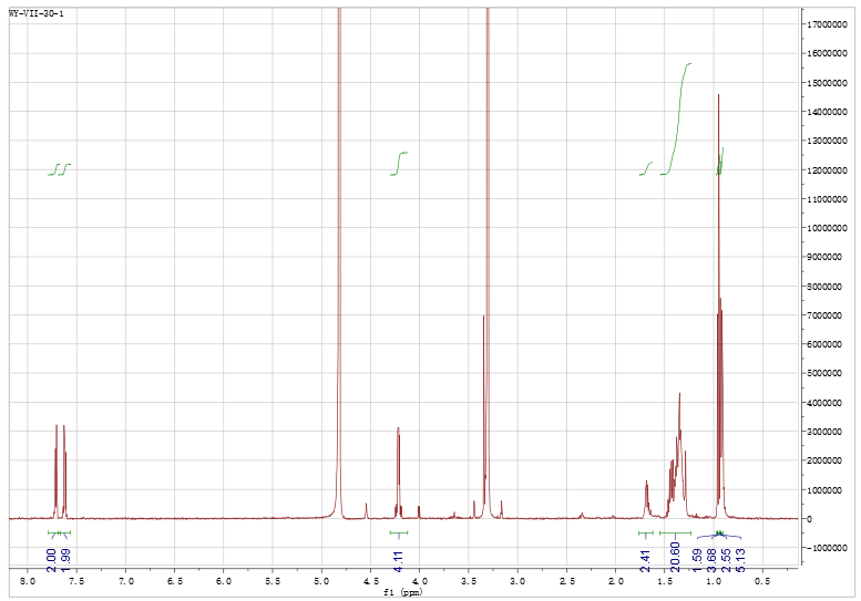 我的分子结构可能是一链醇连有对溴苯甲酰氯基团,预期4ppm左右是积分为2的t峰,但现在出现积分为4的多重峰,且峰形是这样的,讨论了很久后尚未找到解释原因,求虫友指教。。实验目的是推测醇的结构,因此不确定上了几个酰氯,但7ppm的峰积分(苯环信号)和4ppm左右的峰积分关系为1:2,尚未想通