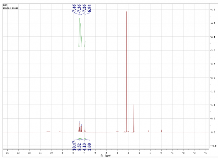 用的三乙胺做缚酸剂,溶剂是无水DCM。反应完成后有沉淀物生成,过滤出沉淀物,去打氢谱。氢谱图如下: 用的氘代DMSO,想请问各位大神,这是生成的二苯脲吗?如果是的话,为何N原子上的氢没有出峰,而苯环上那么多氢? 返回小木虫查看更多