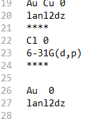 如果你检查到教程中c部分 ,就可以发现是因为你的基组写的不对。你对au原子用了lanl2dz基组,但是基组的赝势部分你得单独定义。你可以看同样的教程中的1.1节 就是讲怎么写混合基组和赝势的。 截图也附上了
