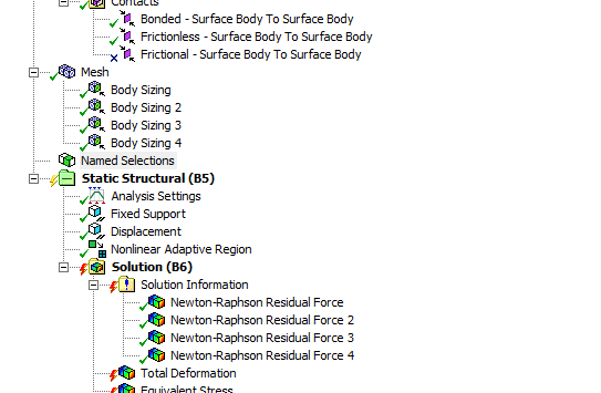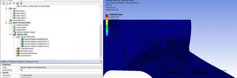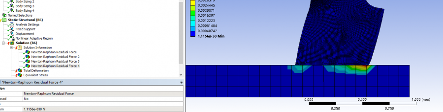 硅橡胶被按压,见图。载荷-1.2mm,大变形后网格发生畸变,我已经使用了非线性自适应网格。 是不是还要细化网格还是要怎么设置? 网格畸变 网格畸变 捕获2.PNG 捕获3.PNG 自适应设置 残余力 残余力 返回小木虫查看更多
