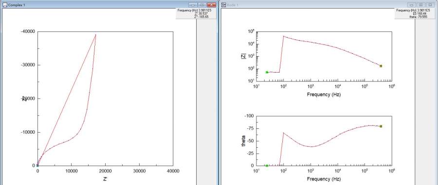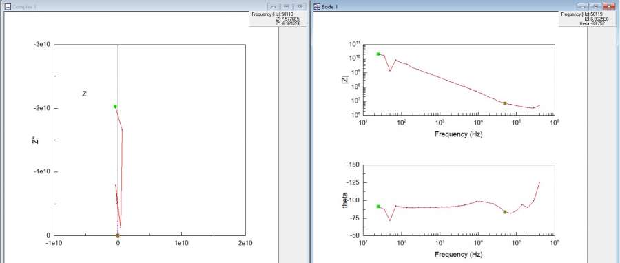 最近测试EIS遇到了些问题。我们实验室是用探针台连接探针去接触薄膜样品,测试过程中升温+通湿润的氩氢混合气,测试设备是solaron 1260+1296,测试温度为200-400度。可是每次测试,Nyquist图都没有测出过半圆,经常是散乱的点,而且在低频下会偏向第二象限,请问有没有小伙伴知道这是为什么呀?(电极是利用磁控溅射在薄膜样品上喷200nmPt做的紧密条纹电极)