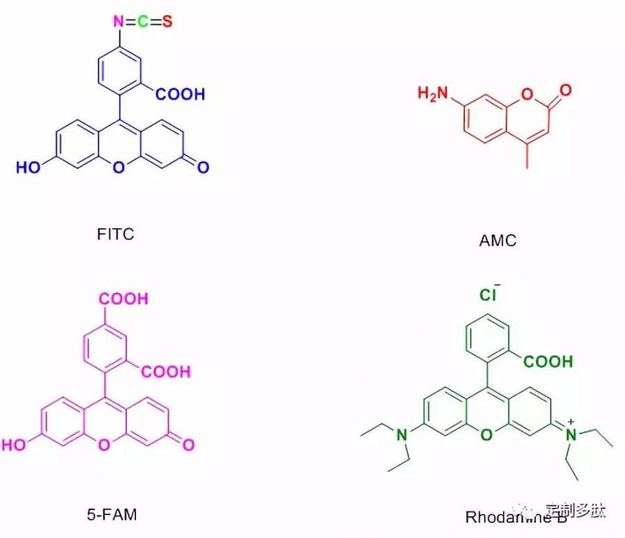 荧光标记物质在蛋白的功能研究、药物筛选等领域也有着广泛的应用。人们利用利用荧光标记的多肽来检测目标蛋白的活性,并将其发展的高通量活性筛选方法应用于疾病治疗靶点蛋白的药物筛选和药物开发(例如,各种激酶、磷酸酶、肽酶等)。因此,多肽的荧光修饰,同样是多肽合成领域的重要内容。