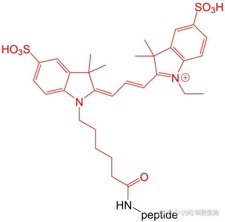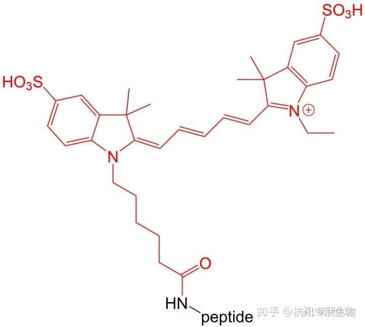 Cy3 and Cy5 是高消光系数的染料。因此,它们特别适用于细胞内敏感的多肽定位实验。它们的缺点是在多肽合成的环境中非常的不稳定,因此合成的量相对低。
