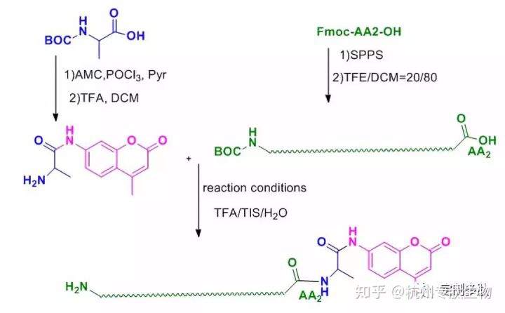 与其他荧光染料不同的是,AMC修饰多肽分子是从C端进行:(1)AMC与肽链C端第一个氨基酸反应;(2)固相合成整条肽链(从第二个氨基酸开始),并且保留整条肽链的侧链保护基和最后一个氨基保护基;(3)液相缩合AA-AMC与全保护的肽链;(4)切除保护基,完成肽链的修饰。