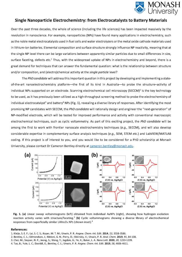 Two full PhD scholarships (tuition + living stipend) are available in the group of Dr Cameron L. Bentley at Monash University, Australia. Dr Bentley’s research centres on the use of scanning electrochemical probe microscopy (SEPM) to “see” the nanoscale active sites of electrodes during operation. Relating electrochemical activity on this scale to the underlying electrode surface structure guides the design/synthesis of the “next-generation” of materials with higher activity, improved stability, longer cycle life etc. Further information on the projects is available in the attached documents.