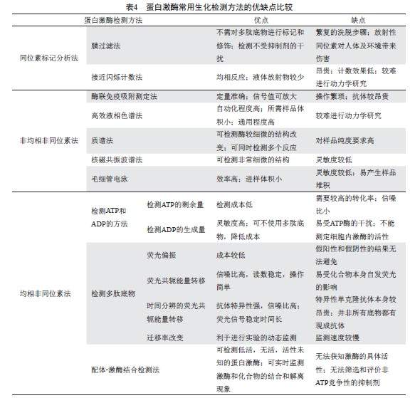 虽然上述方法早已经见诸报道并被广泛应用,然而,现在最经常使用的还是放射性同位素标记ATP,荧光标记(包括荧光偏振\荧光共轭能量转移\时间分辨荧光以及化学发光等)检测方法。这些方法均以微孔板作为载体,具有试剂消耗量低,检测速度快,通量高的优点,成为较普遍应用的一些蛋白激酶检测方法。表2是常见的蛋白激酶生化检测方法的列举及优缺点比较。