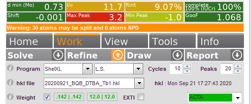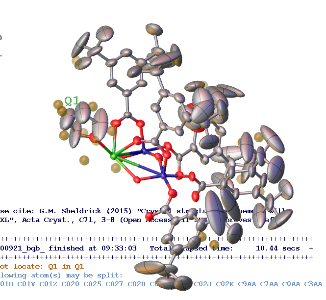 有个问题想请教一下大家,我在结构解析的过程中在四氢呋喃的上方有一个较重的Q峰,但是试着将其定为C后,精修,又自动变为Q峰,且各向异性精修之后,最大Q峰显示3.1,关于其周围的无序类型也没有判断出来,现在不知怎么处理了?不知大家遇到过这种情况没有,或者说大家帮我看一下数据需要再次测试吗?