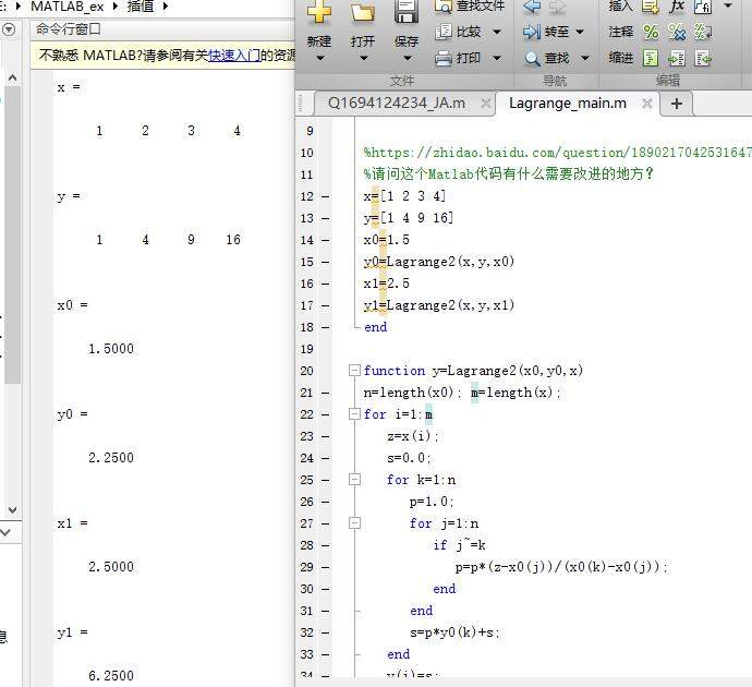 请问这个matlab代码有什么需要改进的地方? 计算lagrange插值多项式的代码,输入x= 返回小木虫查看更多